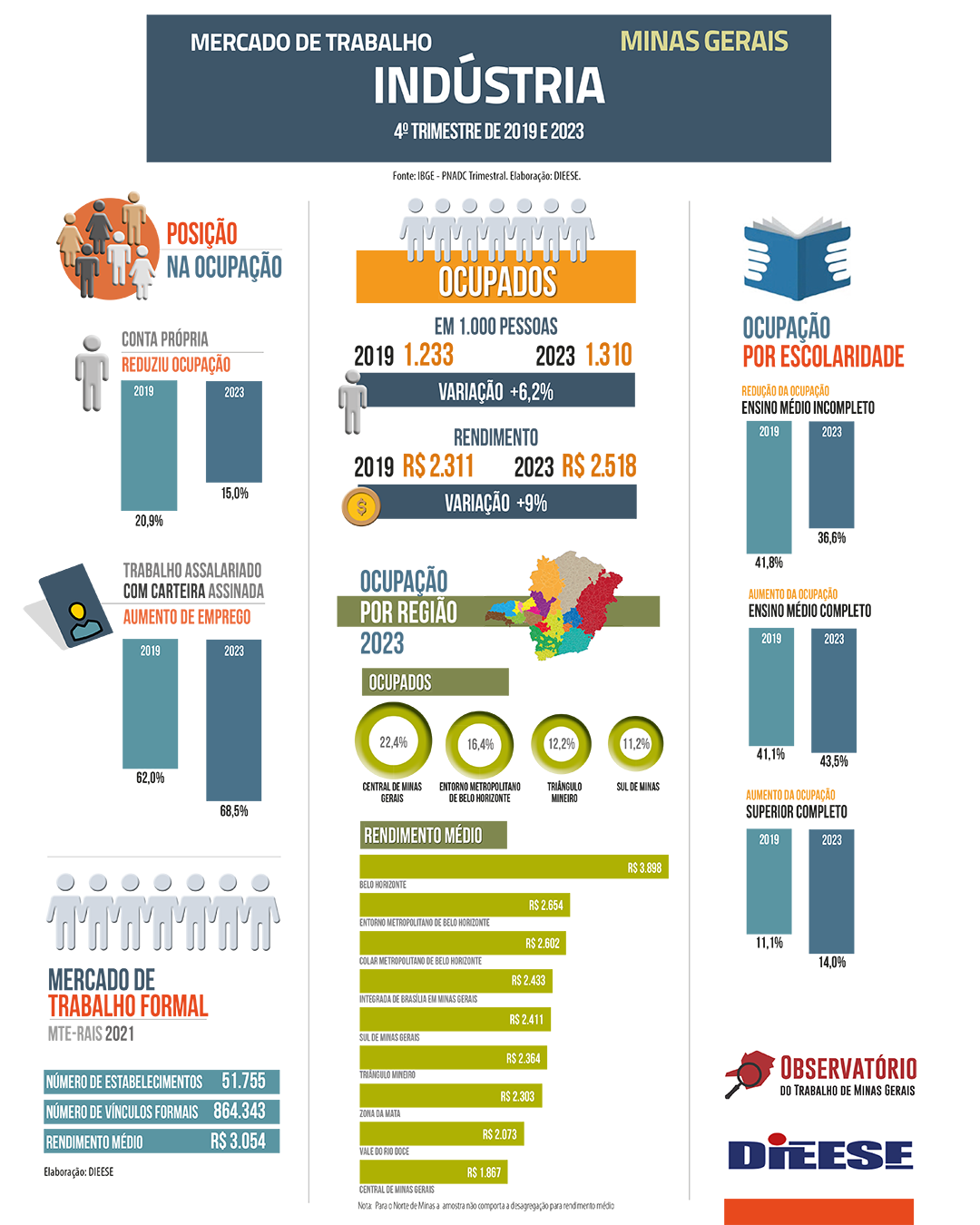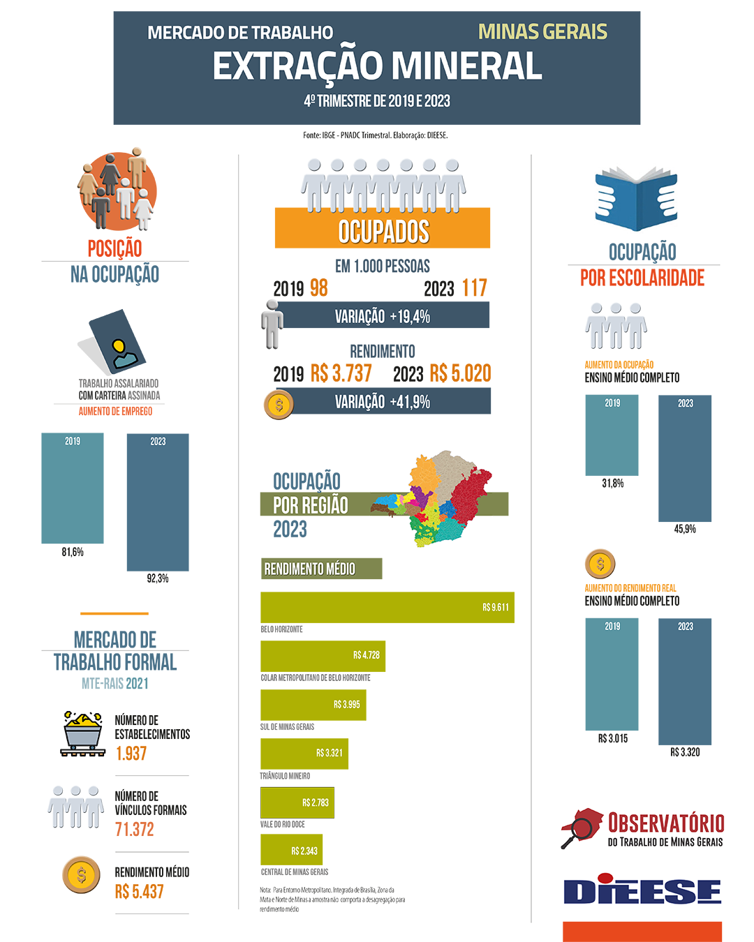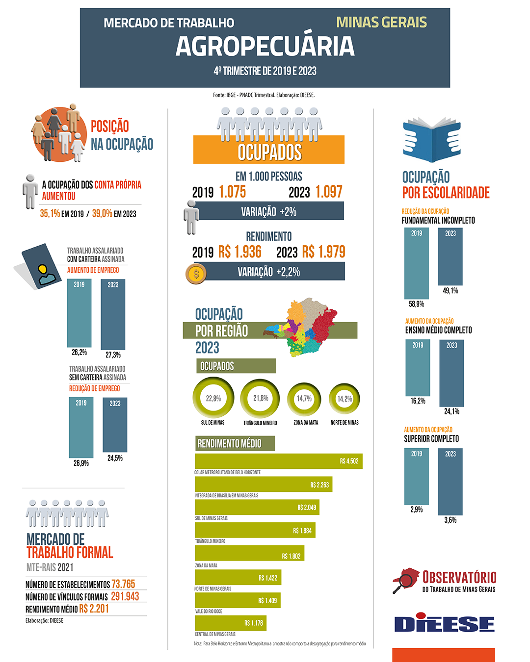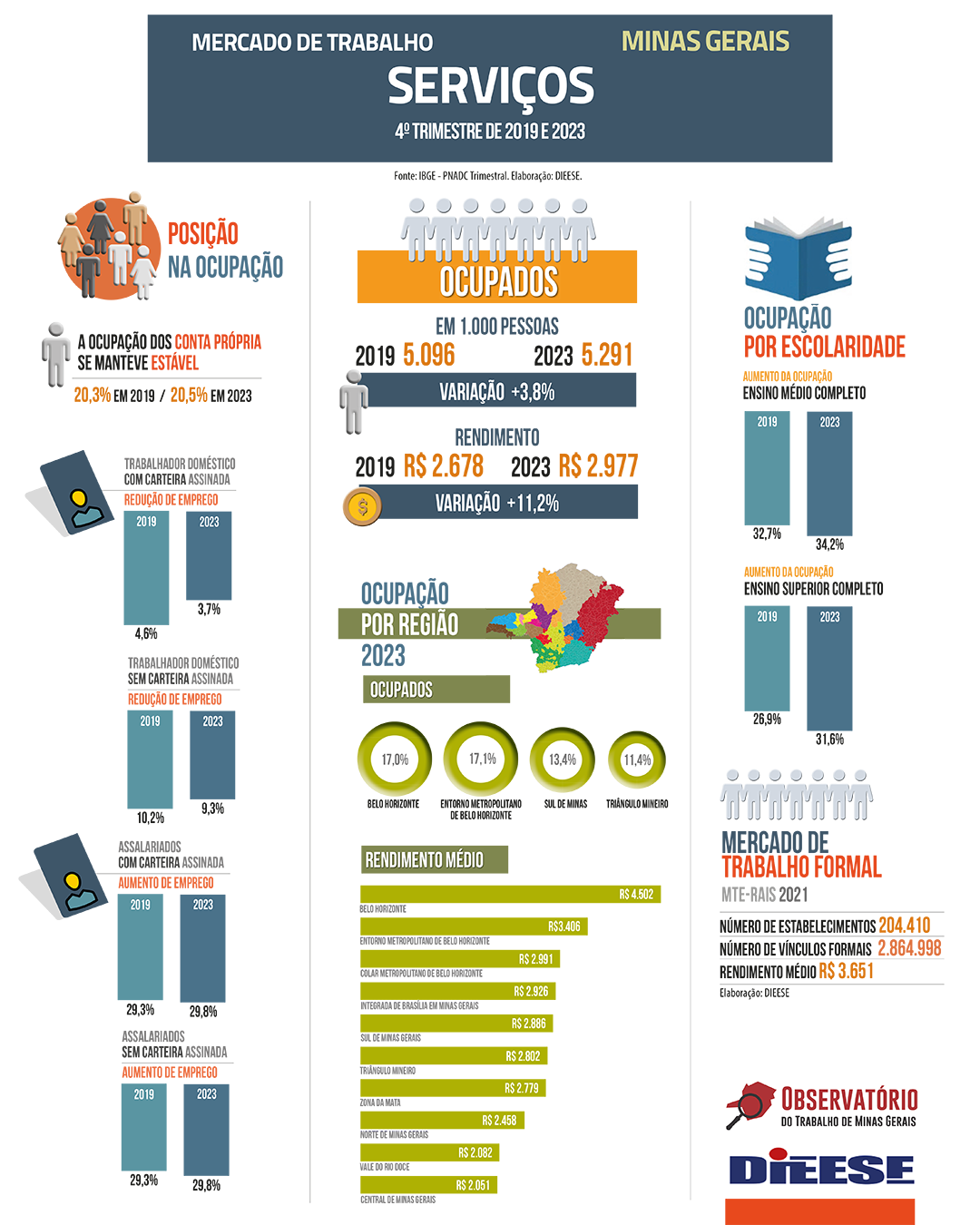 O Observatório do Trabalho de Minas Gerais em parceria com o Departamento Intersindical de Estatística e Estudos Socioeconômicos – Dieese, elaborou um infográfico sobre os indicadores no 4º trimestre do mercado de trabalho em Minas Gerais, no ano de 2019 e 2023, acerca dos setores de Agropecuária, Serviços, Extração Mineral e Serviços.